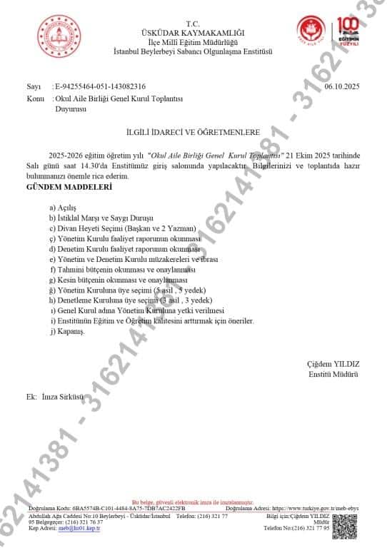 2025-2026 eğitim öğretim yılı "Okul Aile Birliği Genel Kurul Toplantısı" 21 Ekim 2025 tarihinde Salı günü saat 14.30'da Enstitümüz giriş salonunda yapılacaktır.
